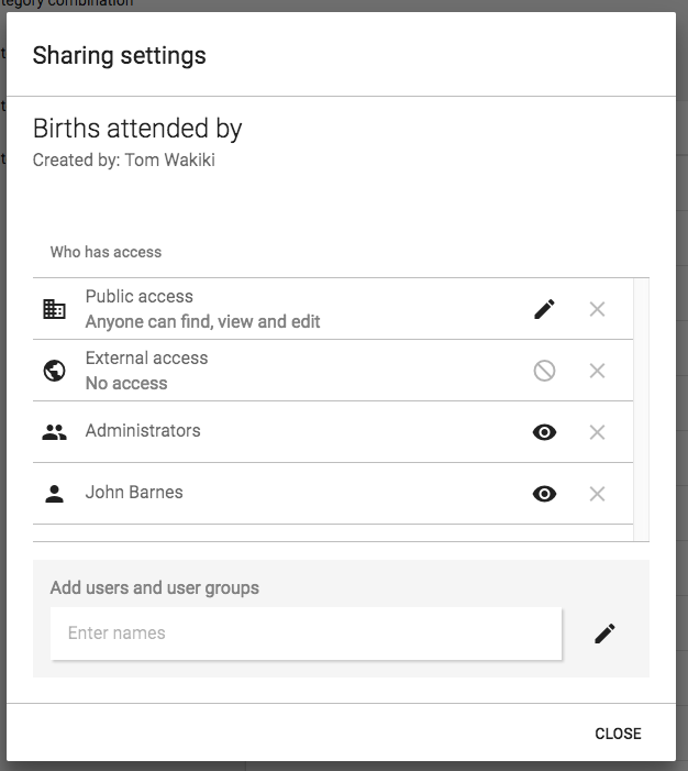 • External access: Allows sharing with everyone, including users who cannot log in to DHIS2. Useful for public resources accessible via a URL.