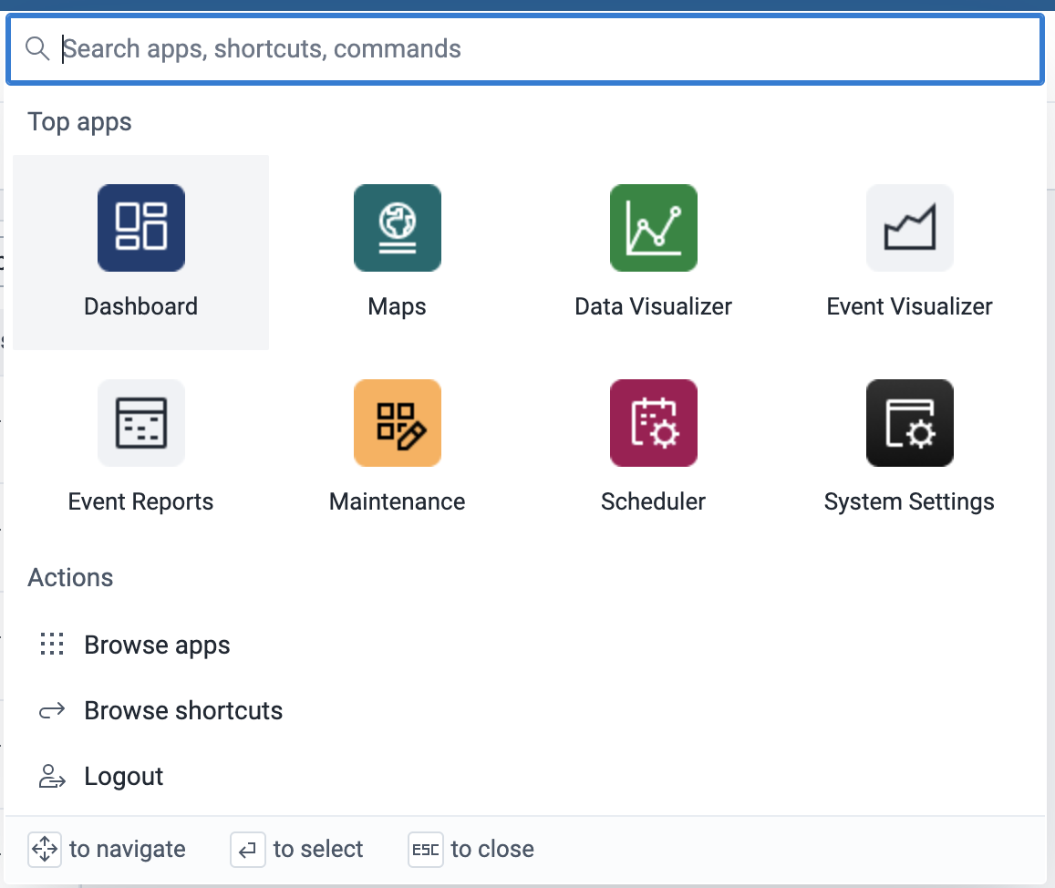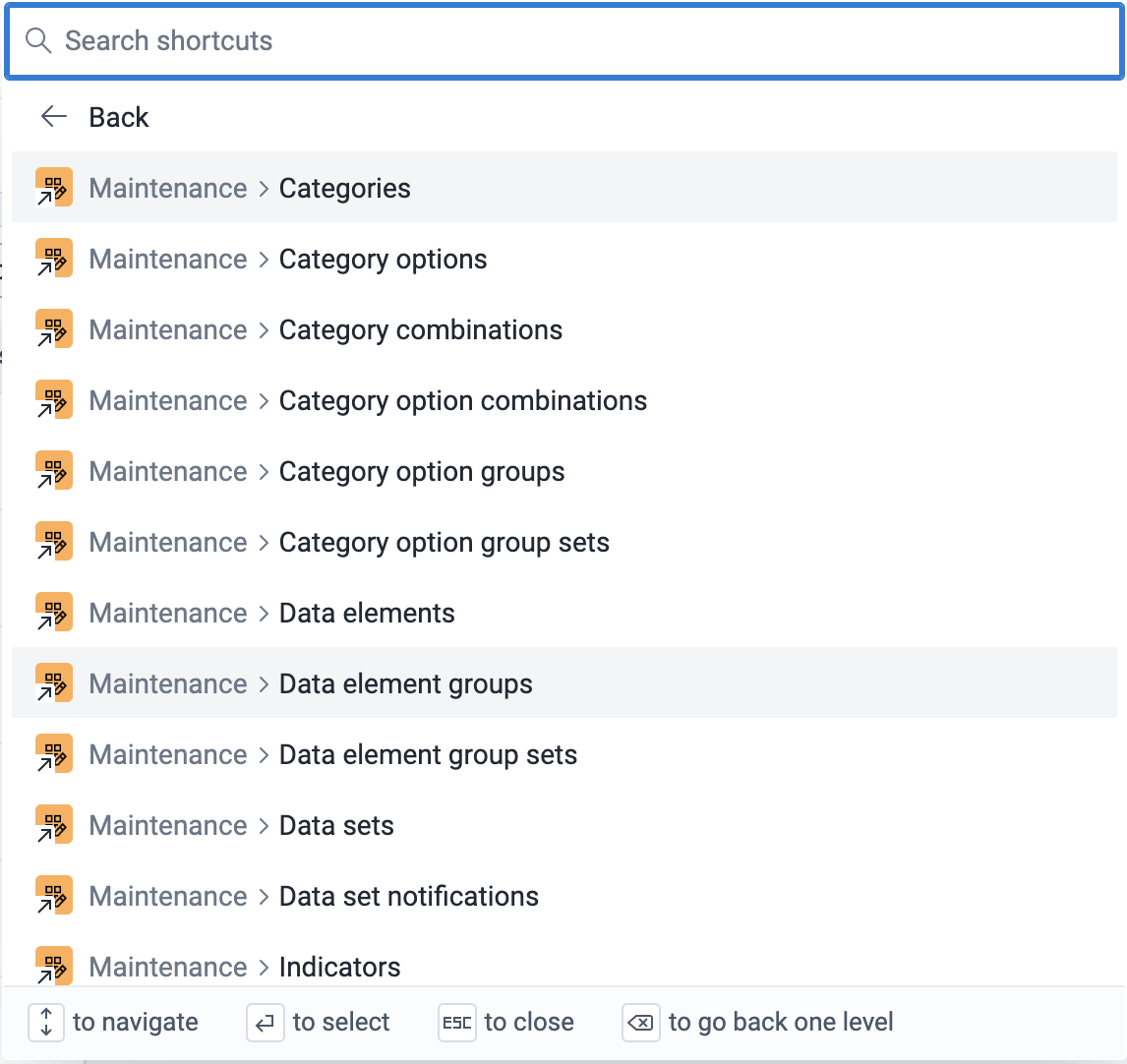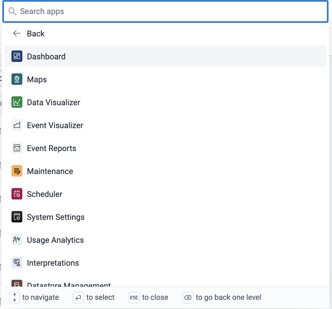 - Or, press CMD/CTRL + K while anywhere within the DHIS2 instance.