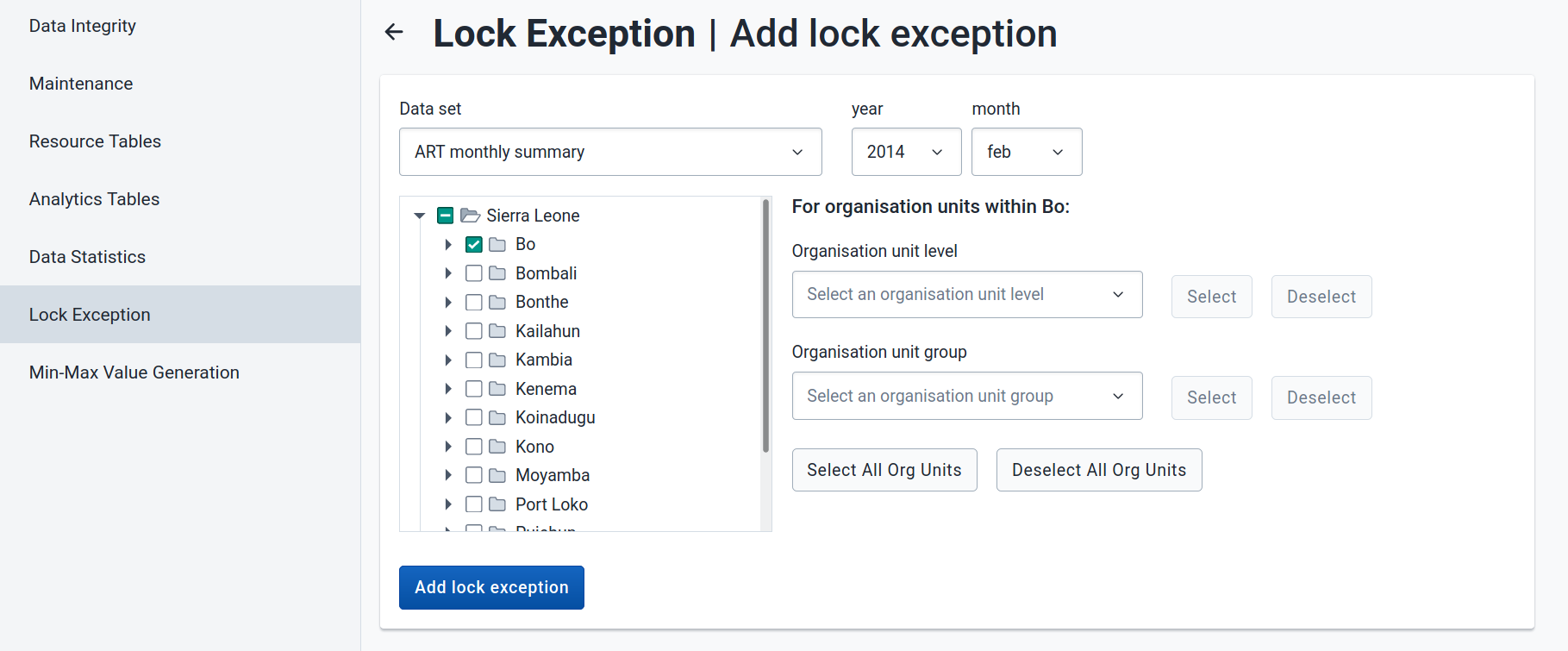 In the example above, a data lock exception would be created for "Bo" for the "ART monthly summary" dataset for "February 2014".