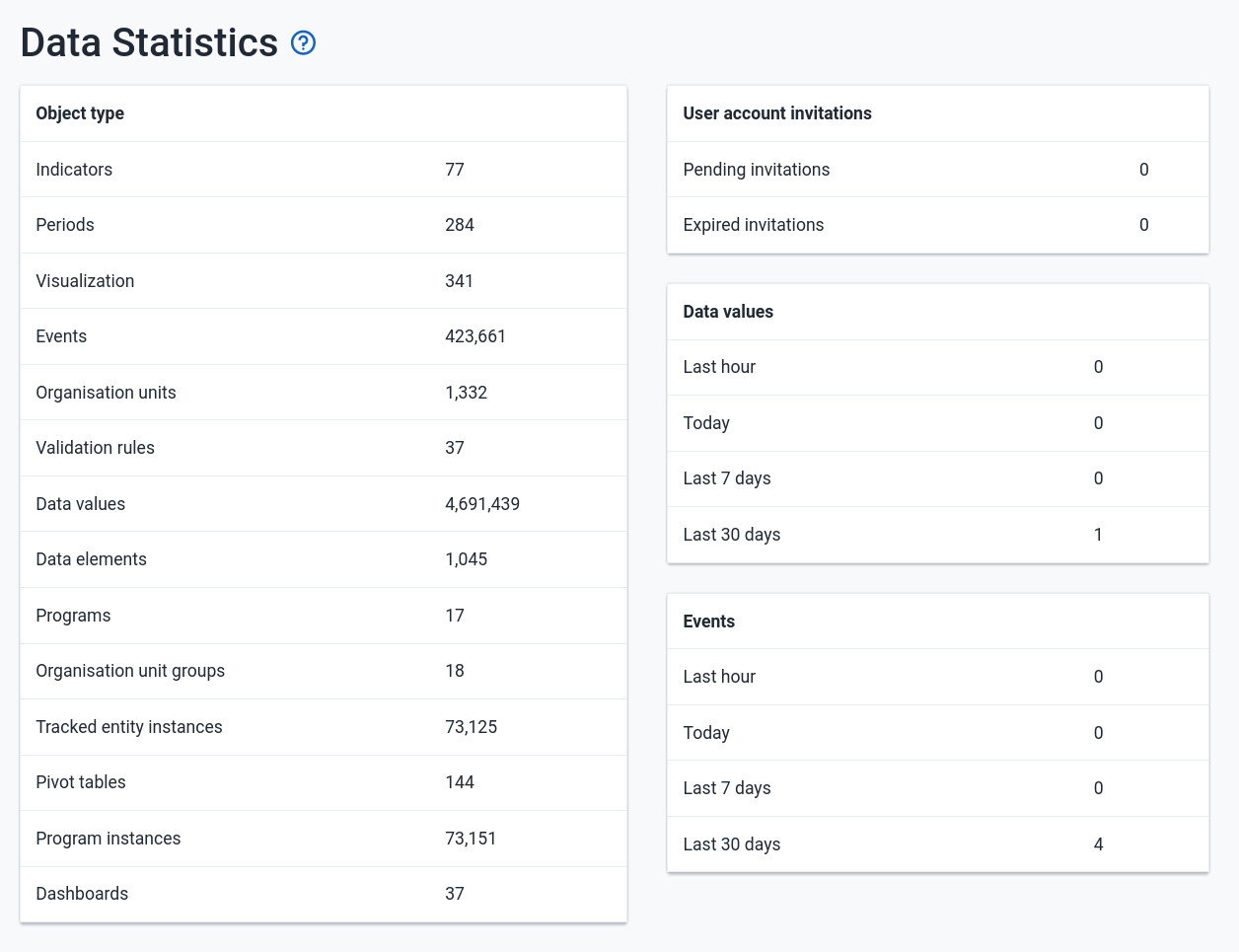 The data statistics module provides an overview of the number of objects stored in the DHIS2 database.