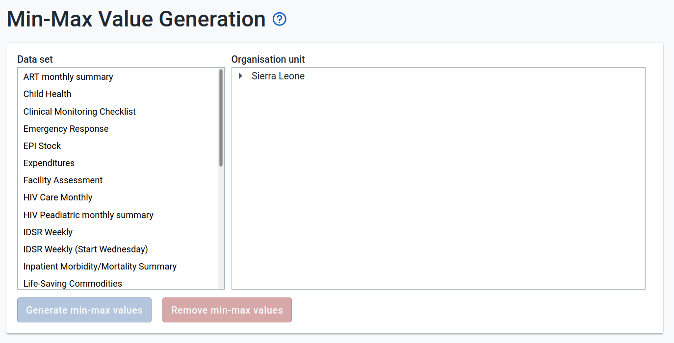 This administrative function can be used to generate min-max values, which are used as part of the data quality and validation process for specific organization units and data sets. Simply select the dataset from the left hand frame, and then select the required organisation units to generate the min-max values for from the organisational units selector on the right. Press the "Generate" button to generate or regenerate all min-max values. Press "Remove" to remove all min-max values which are currently stored in the database. In order to run this function, the user MUST have the authority F_GENERATE_MIN_MAX_VALUES.