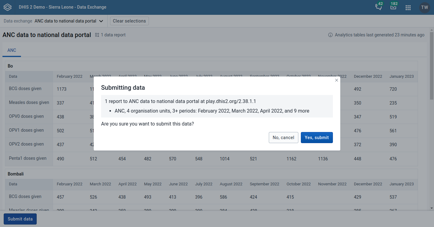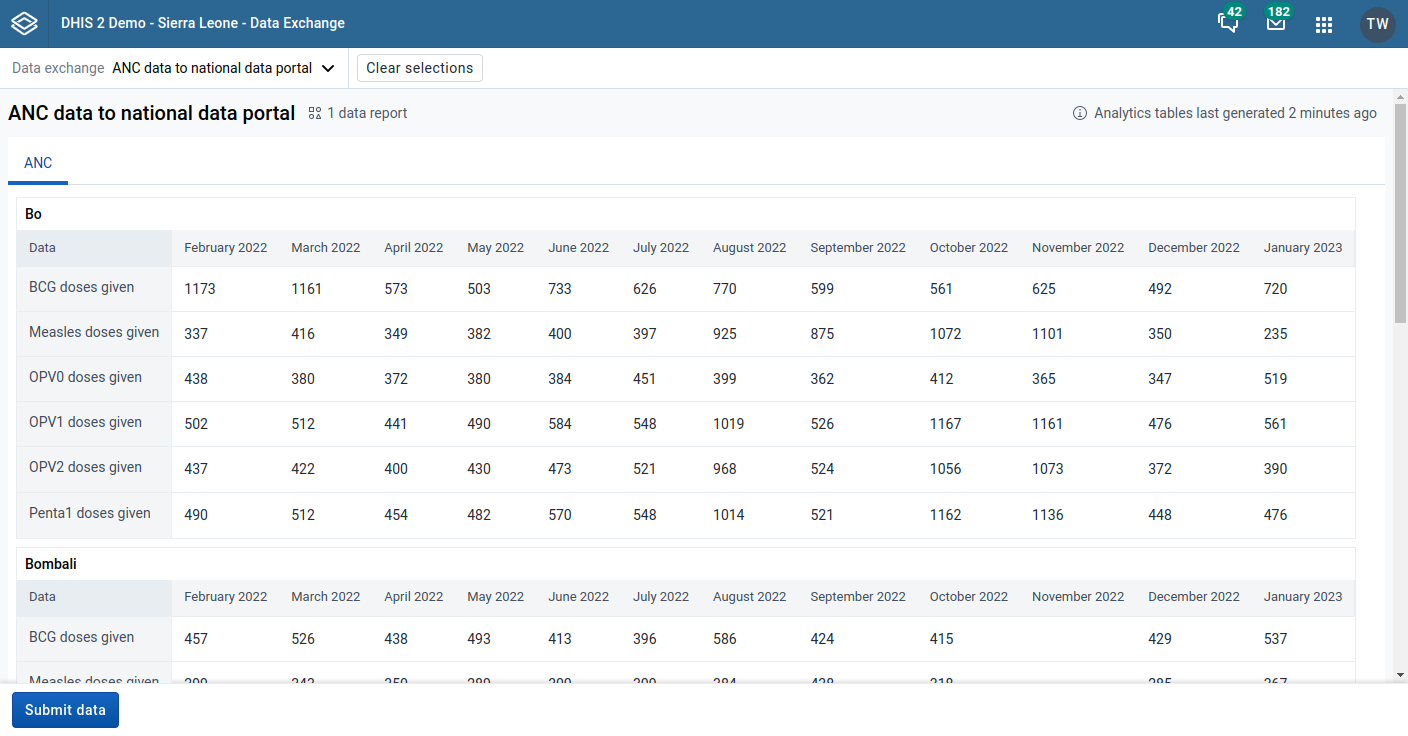 - Submit data: Clicking the Submit data button will exchange data defined by the currently selected data exchange.