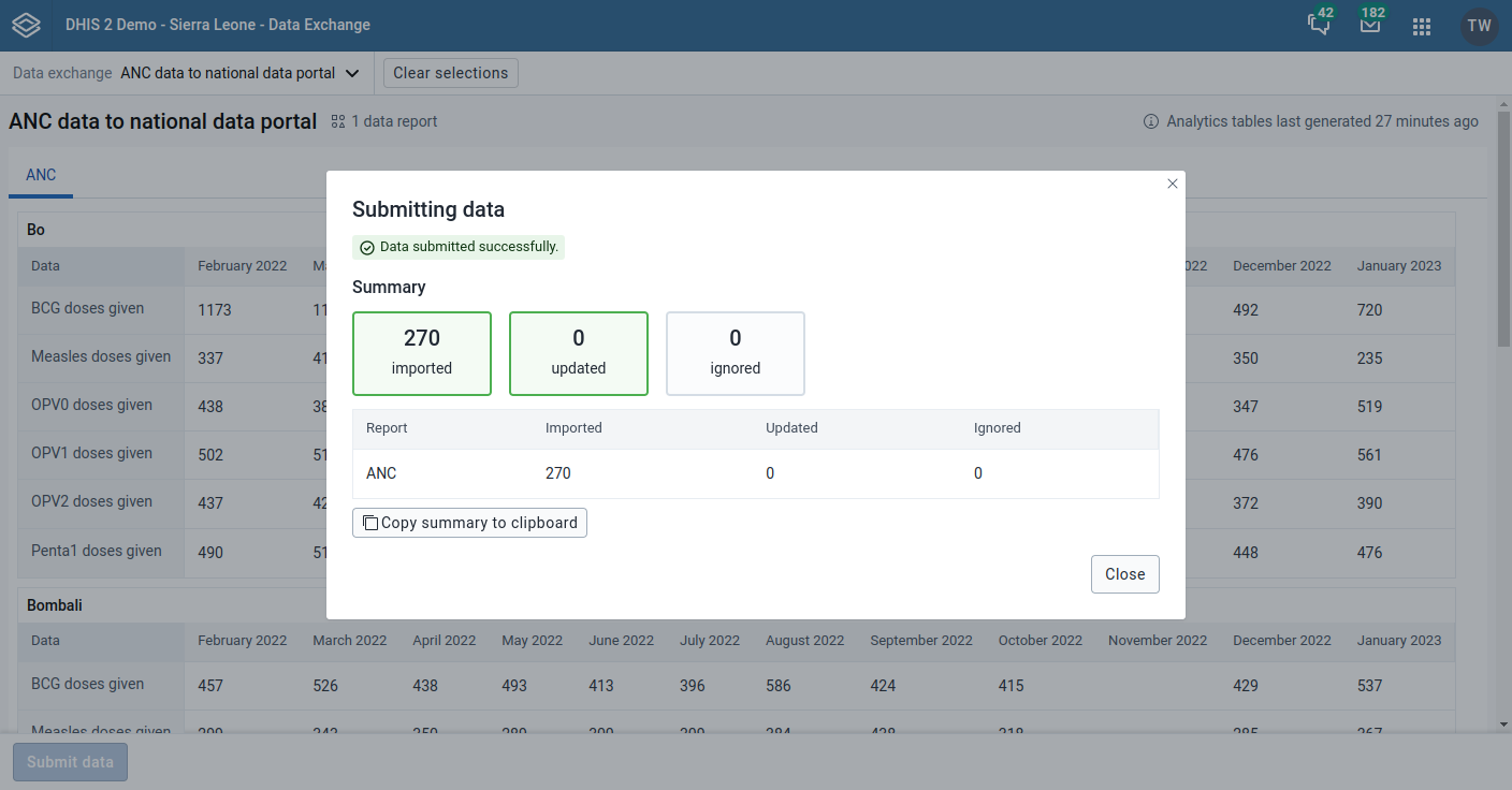 The submission summary indicates the outcome, meaning whether the operation was a success or failure, and how many data values were imported, updated and ignored as part of the data exchange.