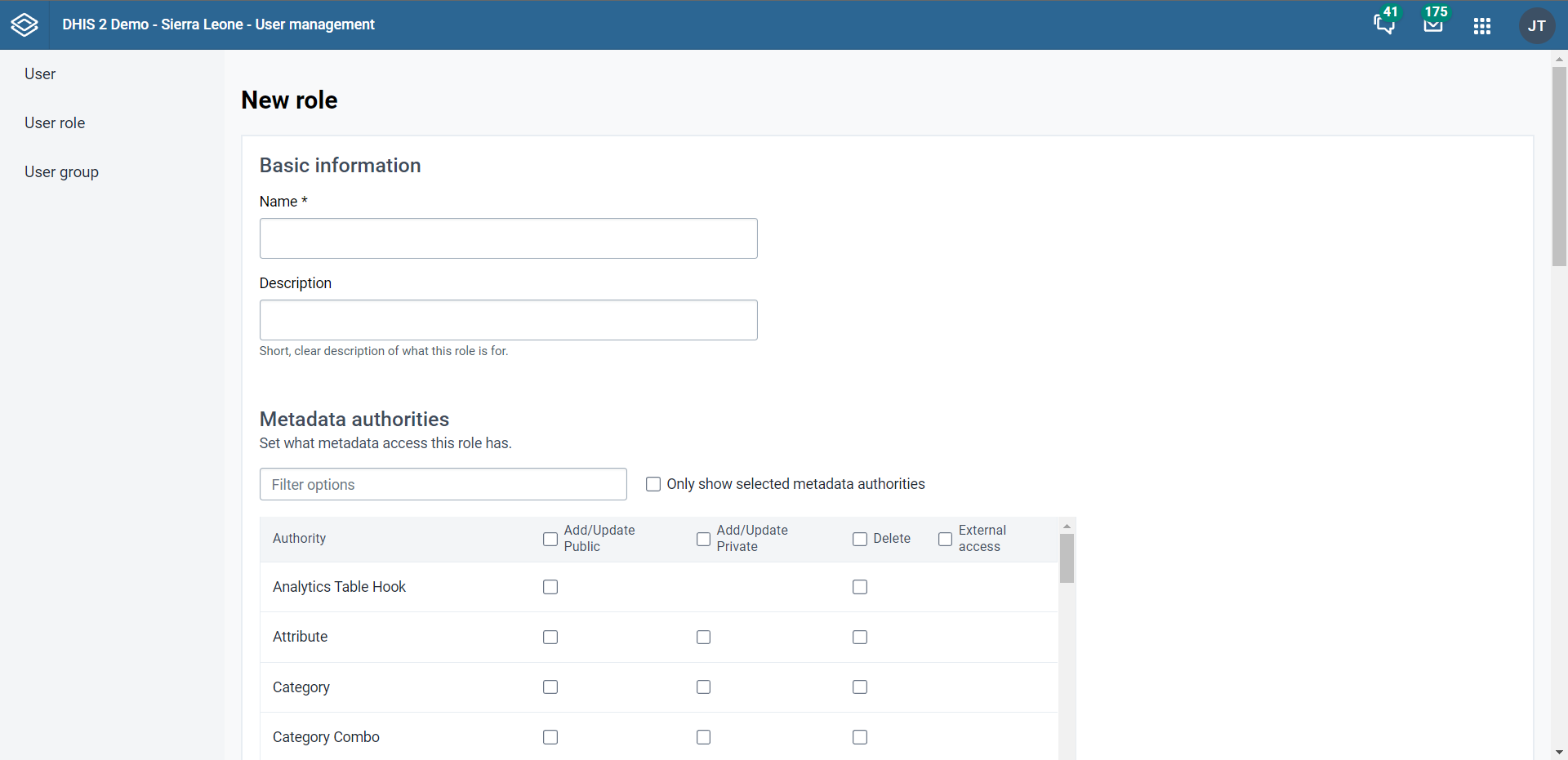 A user role in DHIS2 is a group of authorities. An authority means the permission to perform one or more specific tasks.