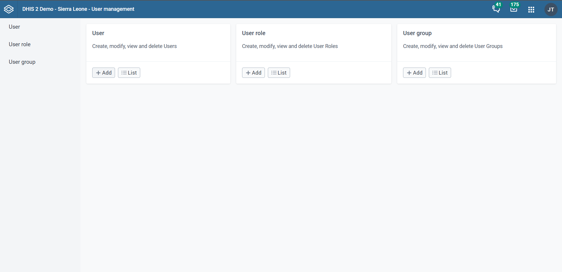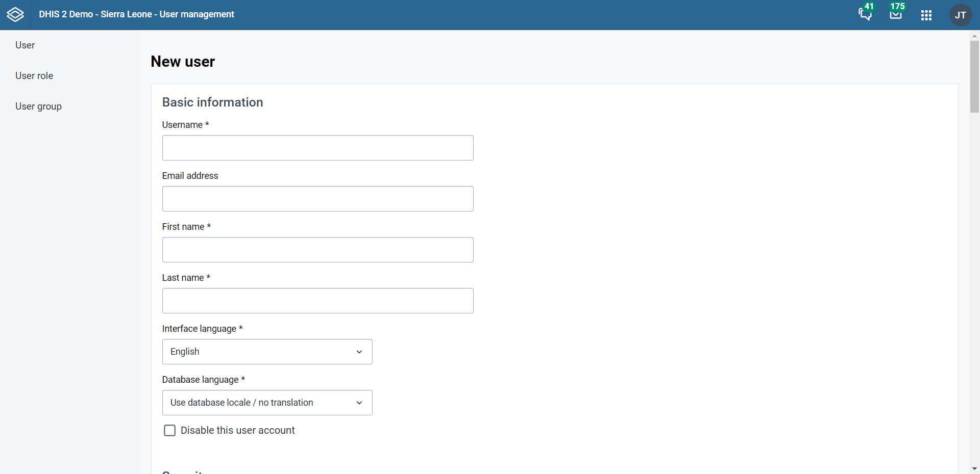Each user in DHIS2 must have a user account which is identified by a user name. You should register a first and last name for each user as well as contact information, for example an email address and a phone number.