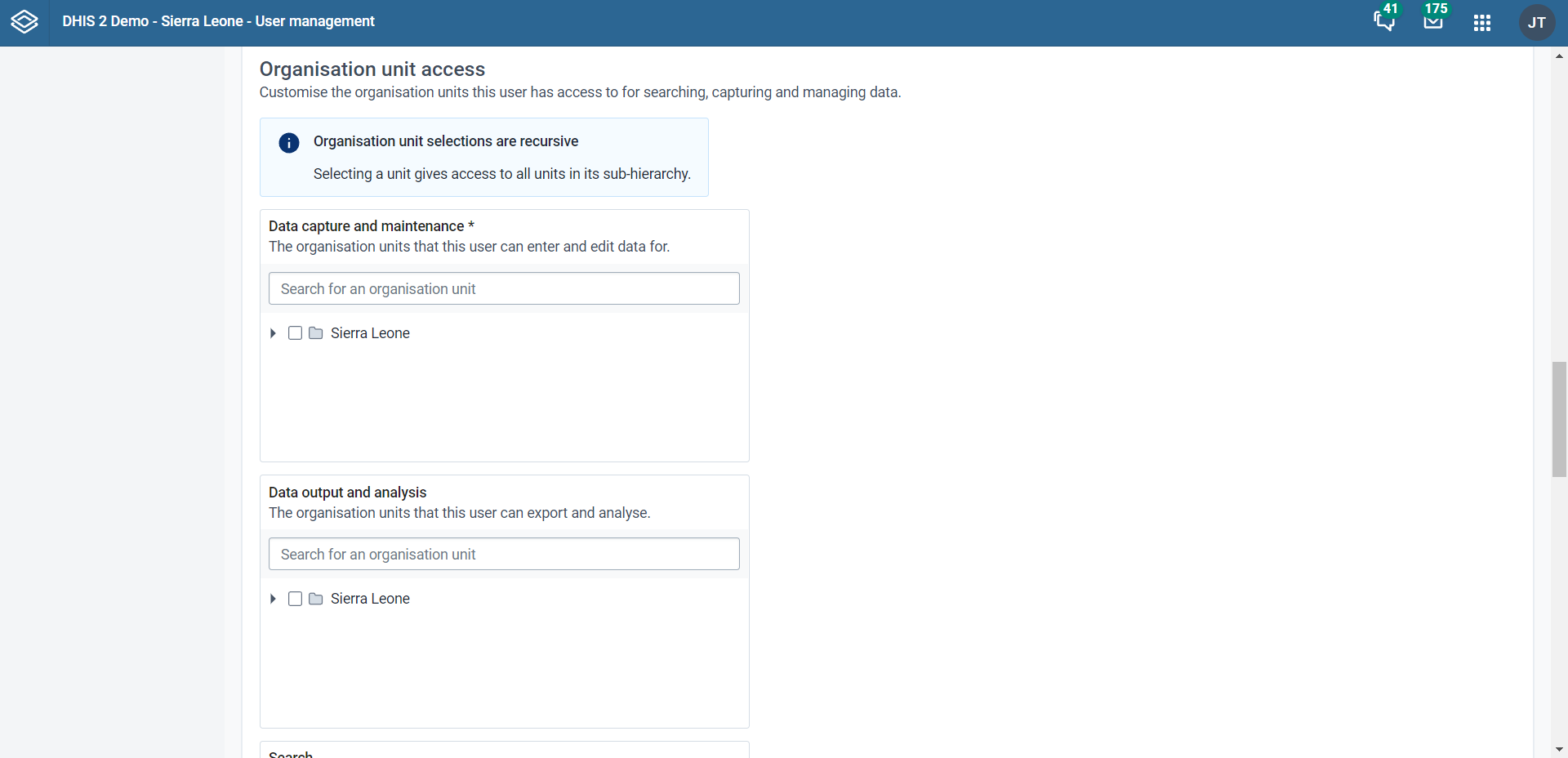 2. In the Search organisation units select the organisation units you want the user to be able to search in. Searching is allowed by default for the data capture and maintenance organisation units (if no search organisation units are selected). If additional scope is provided using the search organisation units, the data capture and maintenance organisation units plus the search organisation units are the scope used during a search.