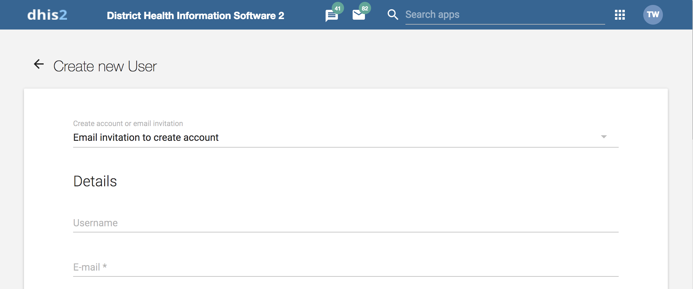 • Email invitation to create account Choose this option if you want to send an invitation by email to the user. Then she/he must return to DHIS2 and finish setting up their user account. The account that the user finishes setting up will be limited according to how you configure the account.