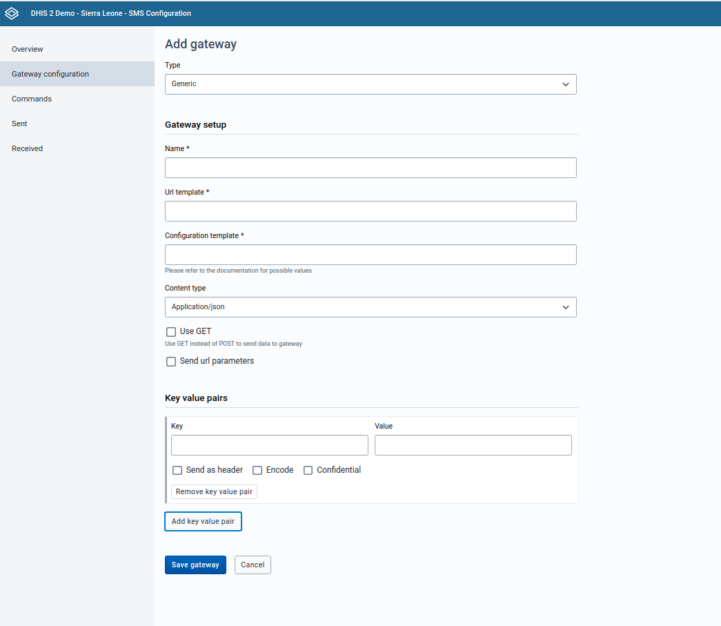 Many DHIS2 instances are using GenericHttpGateway to connect to their local gateways. These local gateways provides HTTP APIs for sending SMS. In new GenericHttpGateway it is now possible to configure generic configuration template for gateway configuration. This template is converted into request payload by replacing place holders with actual values taken from gateway key value parameters.