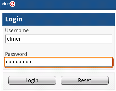 This approach is for data-entry on a smart phone with a mobile browser by navigating to the URL of the DHIS2 instance, for example: the full URL link for demo on dhis2.org http://apps.dhis2.org/dev/mobile/index.action . And your mobile browser will automatically detect the DHIS2 application where the server URL is given (e.g.: http://apps.dhis2.org/dev). Here is the login form to access the application with user-name and password. Click on "Login" to continue or "Reset" to reset: