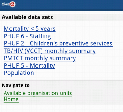 DHIS2 provides a range of options to allow data entry from mobile devices, including a dedicated GPRS/3G J2ME client and two versions of DHIS2 which have been optimized specifically for mobile browsers. Each of these solutions will be described in detail in the following sections. DHIS2 offers several Android clients, which are described in detail in other sections of this guide.