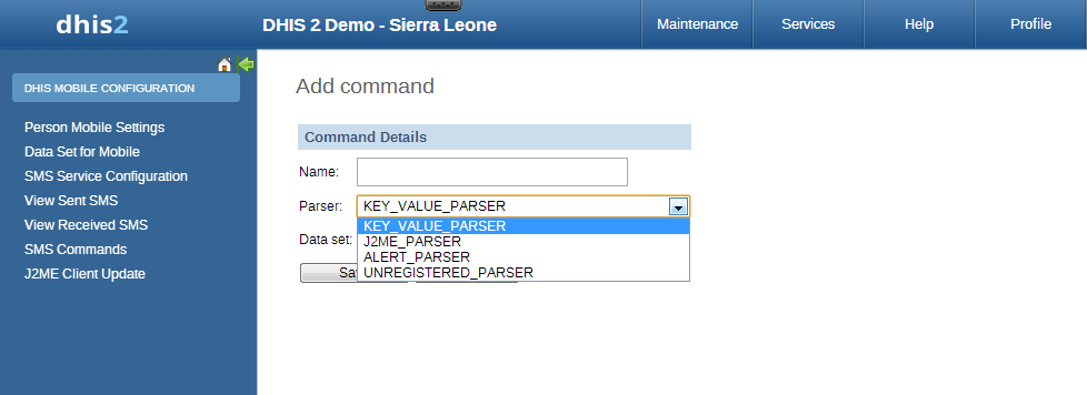In order to report data for example data set (aggregation), we use SMS commands which have KEY_VALUE_PARSER (for phone's plain text), or J2ME_PARSER (for j2me apps)