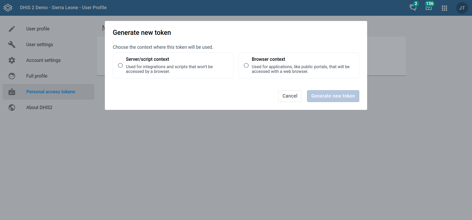 When creating a PAT using the User Profile app, you will be prompted to select the context in which the token will be used.