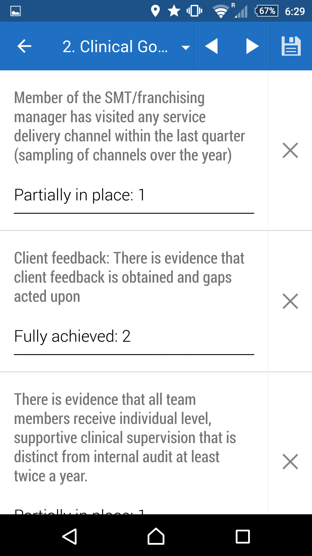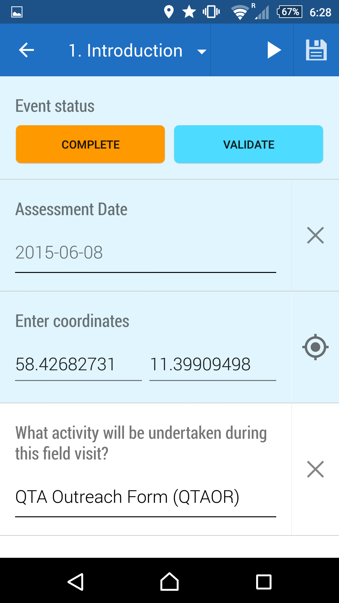 The back button in the top top-left corner will take you back to the main screen (list of events). For programs that have specified sections, these sections will be displayed as a selector at the centre of the top bar. There are also right and left arrows which you can use to move between sections. You can use this selector and arrows to quickly navigate between form sections. The save button in the top-right corner will save what you have entered for the event so far. Data is also saved when you switch between sections.