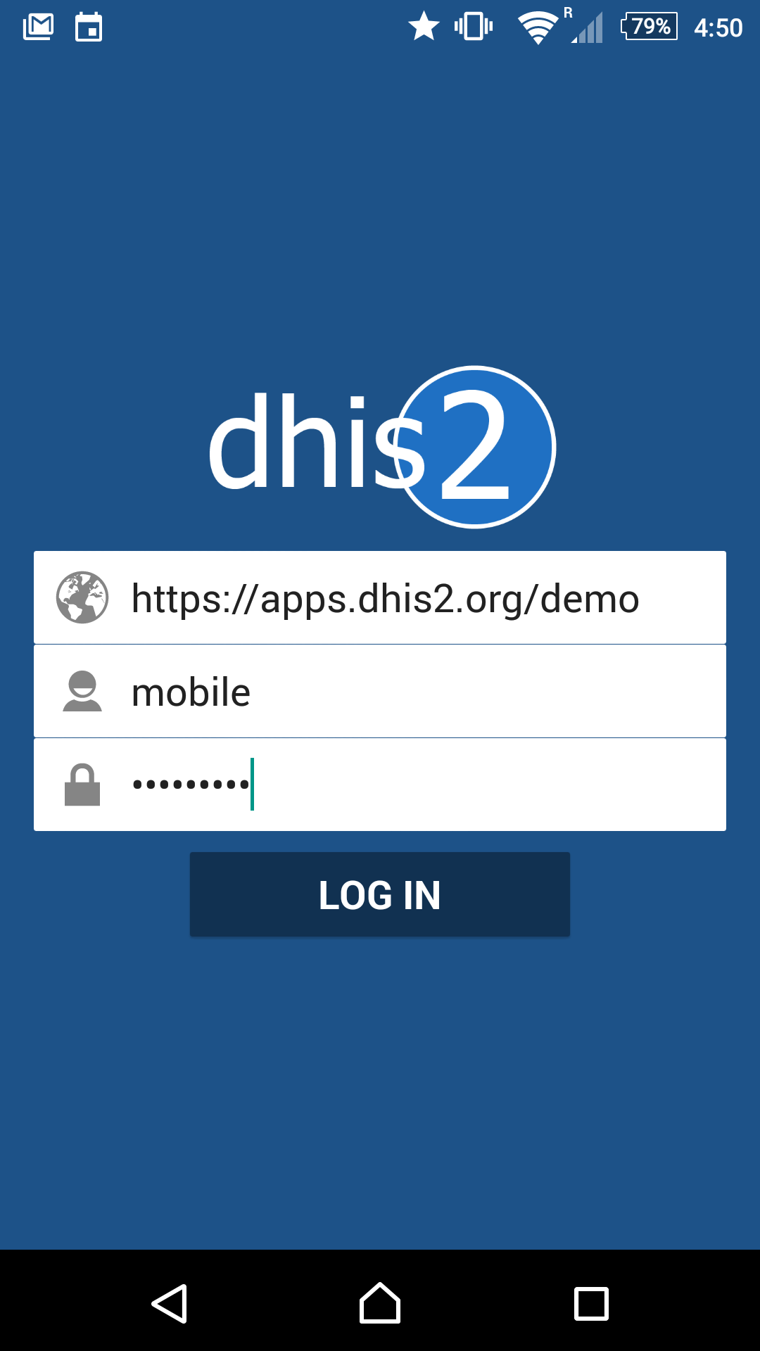 In the URL field, enter the full URL to the DHIS2 instance (server) for which you want to capture and manage events for. Be careful to enter the http:// or https:// part of the URL as well. In the username and password field, enter the username and password for your account at the given DHIS2 instance. Note that you can use this login on the online DHIS2 server as well, i.e. you will be using the same account as you will use when logging into DHIS2 using a Web browser. After logging in the first time, the app will download meta-data from the online instance. This could take a few minutes so please be patient.