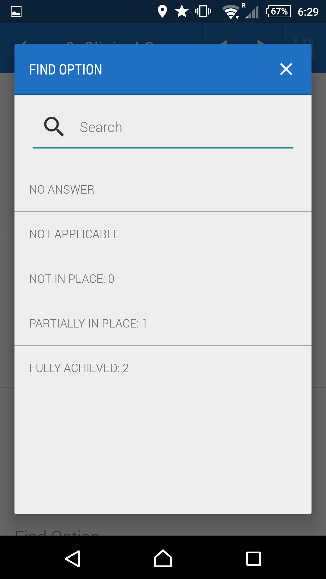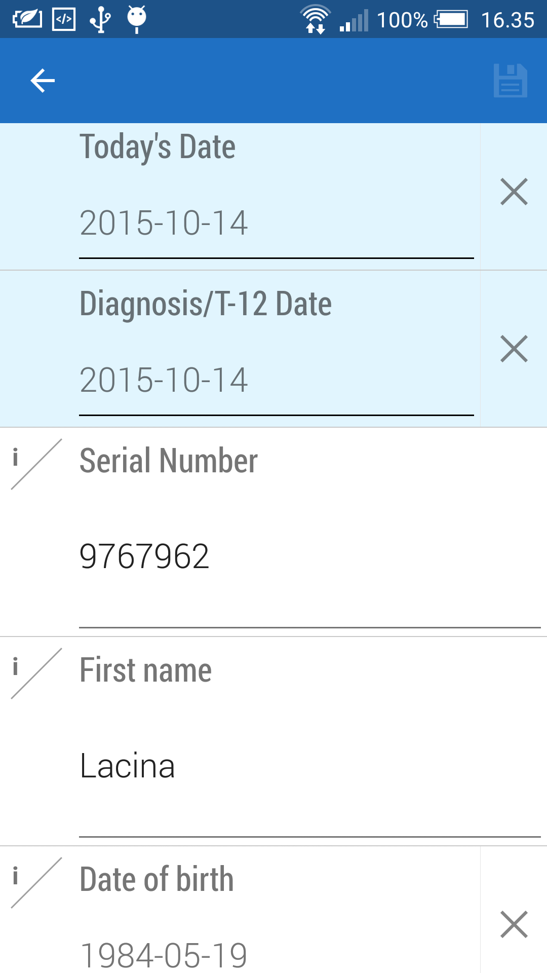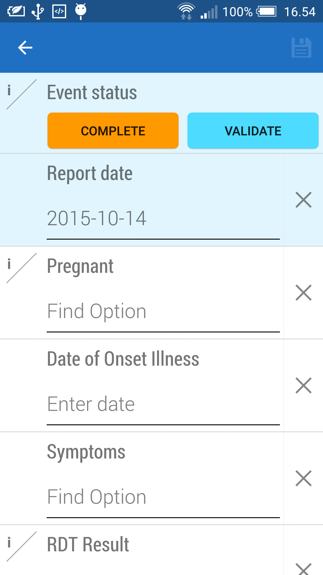 The back button in the top top-left corner will take you back to the main screen (list of events). For programs that have specified sections, these sections will be displayed as a selector at the centre of the top bar. There are also right and left arrows which you can use to move between sections. You can use this selector and arrows to quickly navigate between form sections. The save button in the top-right corner will save what you have entered for the event so far. Data is also saved when you switch between sections.