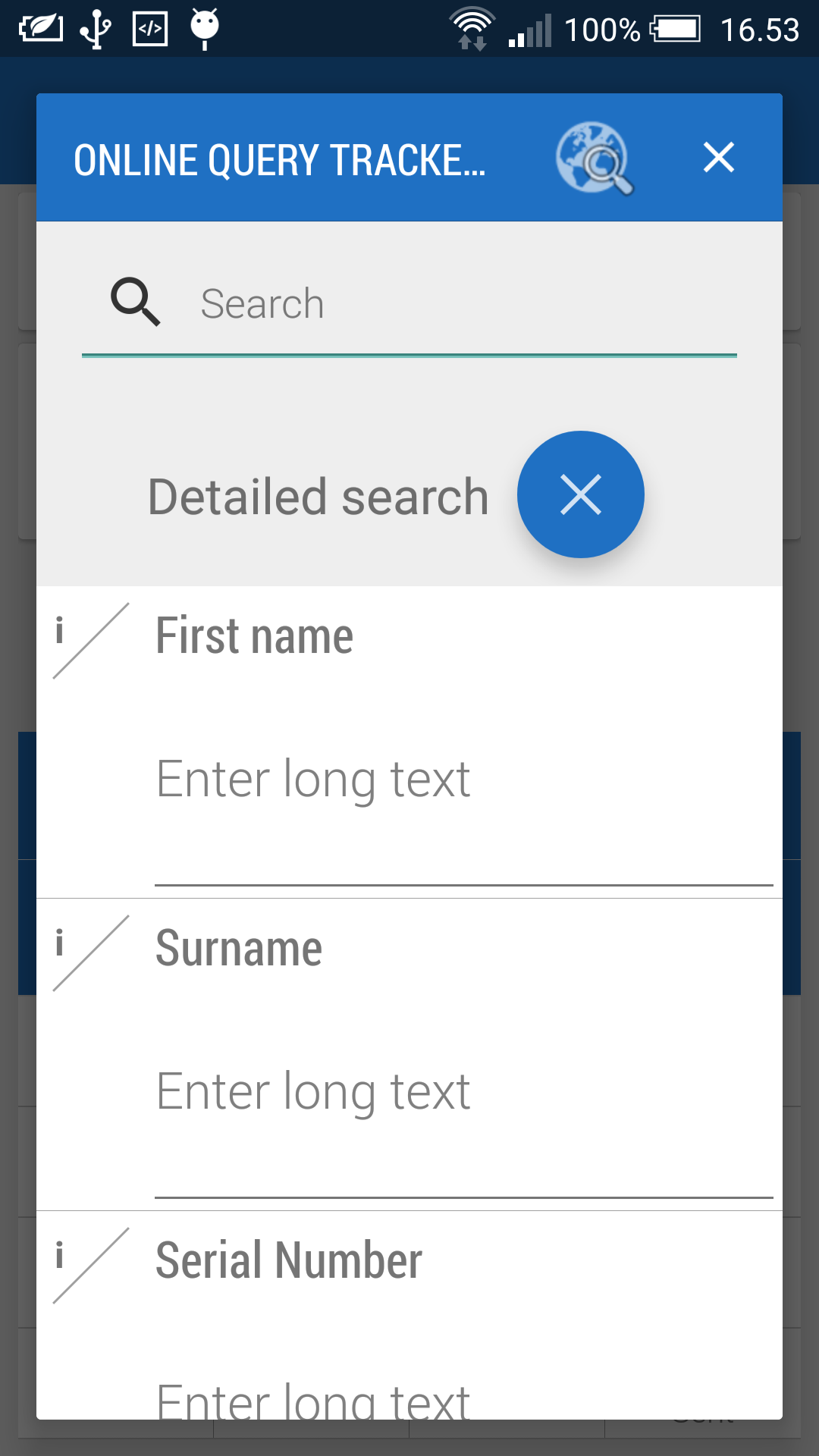 From the main screen press the middle button for querying the server. Since this task requires an Internet connection, please make sure that you have one. This task will query the server with the organisation unit and programme that you have selected from the main screen. After you have pressed this button a dialog appears. In this dialog you can either specify your search by pressing the detailed search button. The detailed search queries the server for tracked entity instances that contains the values that you have specified in your query. When you are finished with your query, press the globe for displaying the results from the server. If you want to display all tracked entity instances from the selected organisation unit and programme, you can simply press the globe button without entering any details. Depending on your Internet connection, this task can take some time so please be patient. A new dialog will present a list of results from your query containing tracked entity instances. Select the tracked entity instances that you want to download by tapping on them (A green tick on the right side will indicate that you have selected the tracked entity instance). After you have selected all your tracked entity instances that you want to download, press the download button, that has an icon with a downwards arrow, at the top of the dialog screen. The tracked entity instances will be downloaded in the background and the synchronization wheel will be displayed. When a tracked entity instance is finished downloading it will appear in the list at the bottom of the main screen.