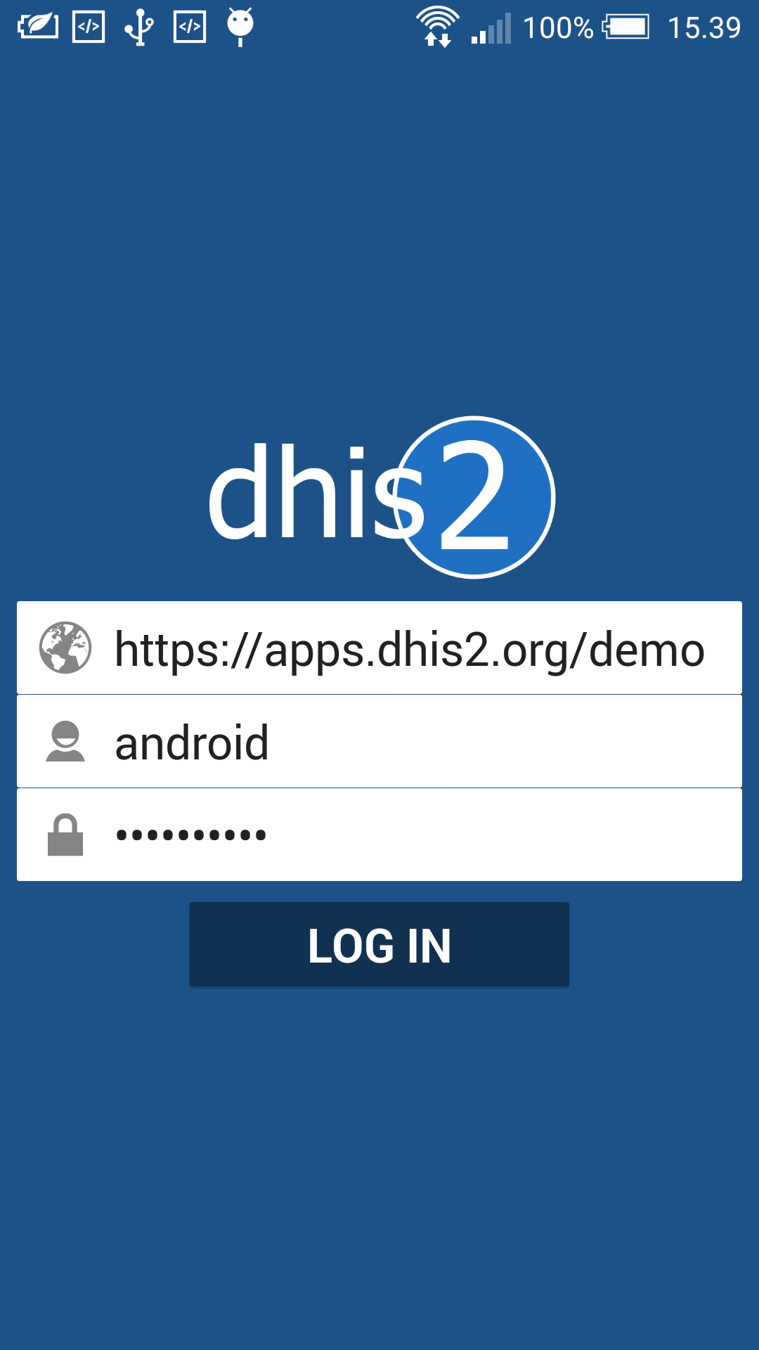In the URL field, enter the full URL to the DHIS2 instance (server) for which you want to capture and manage data for. Be careful to enter the http:// or https:// part of the URL as well. In the username and password field, enter the username and password for your account at the given DHIS2 instance. Note that you can use this login on the online DHIS2 server as well, i.e. you will be using the same account as you will use when logging into DHIS2 using a Web browser. After logging in the first time, the app will download meta-data from the online instance.