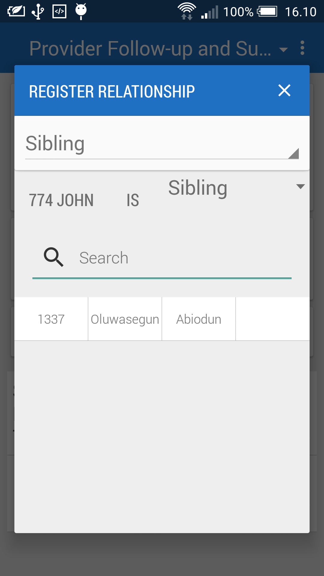 Relationships let you create links between different tracked entity instances. This could be useful in cases where you want to map the relationships between parents and children or persons with malaria breeding sites. To add a new relationship, first press the 'new' button on the relationship box. Now a dialog is presented where you can choose which relationship you want to create from the 'Select relationship type' input field. Below there is a list of tracked entity instances that are already enrolled in the same programme and thus can be chosen. After choosing a tracked entity instance and confirming the relationship then it will show up in the Overview screen.