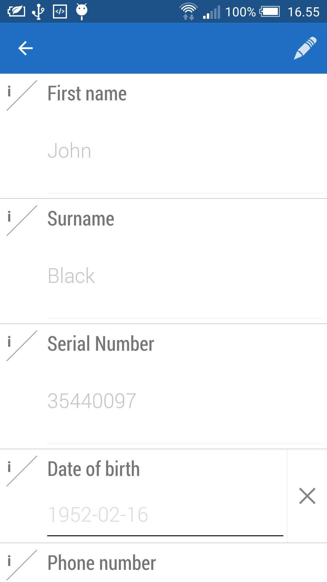 The + button below the selectors will take you to the new enrollment screen. Below this button, all enrollments which have been registered for the selected organisation unit and program will be listed. Each column is configurable, and could show various types of information from each enrollment. The column to the far right shows the synchronization status. Sent means that the enrollment has been uploaded to the server, whereas Offline means that the enrollment is so far only stored at your device. Locally stored data will be synchronized automatically once an Internet connection is present. You can swipe down on the screen in order to trigger a synchronization attempt.